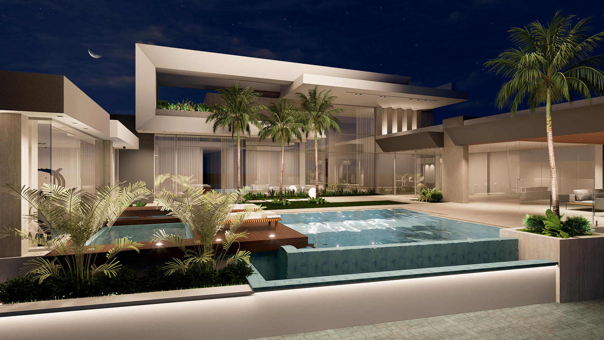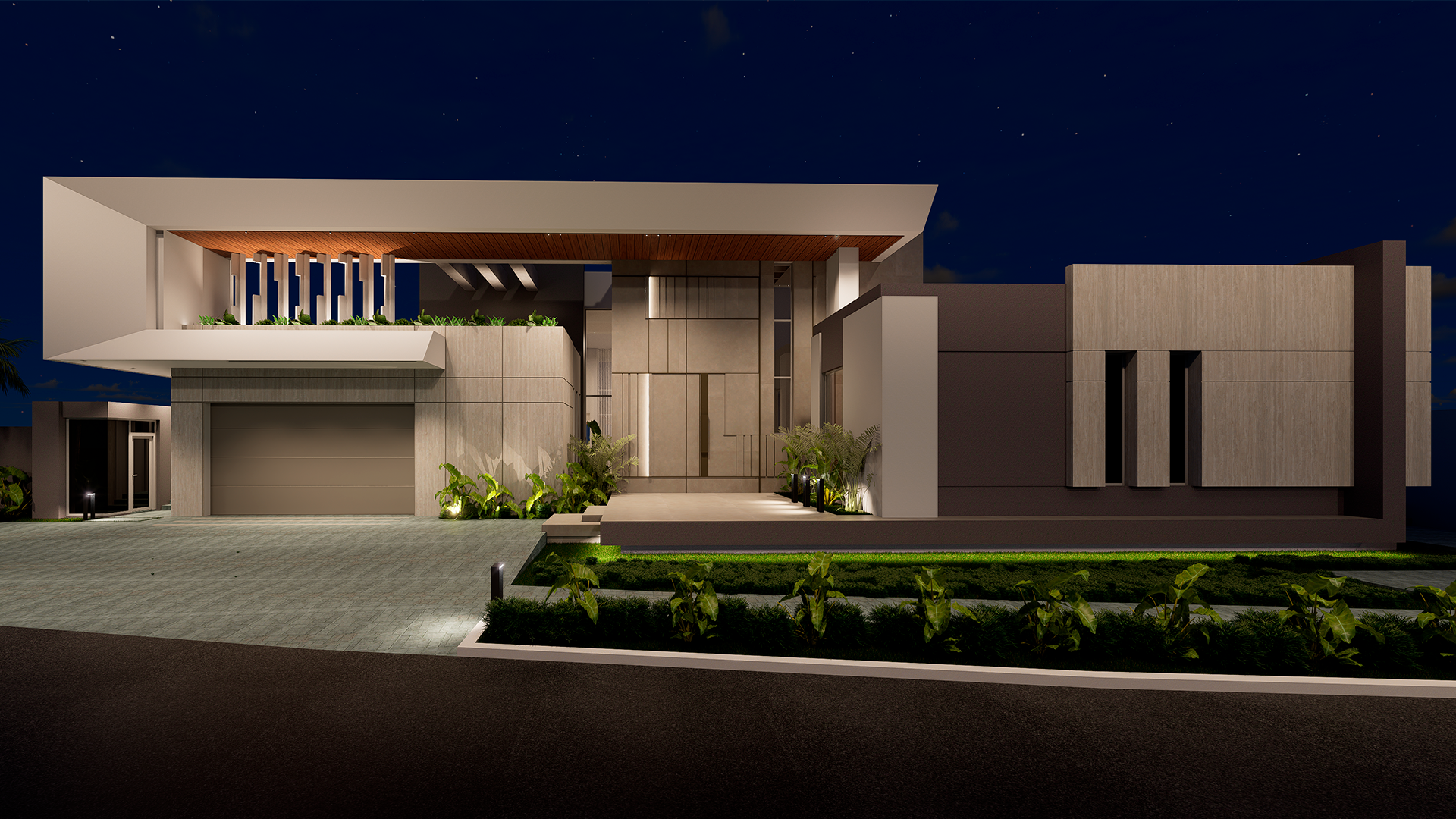 Con una fachada de líneas limpias y proporciones bien definidas, el proyecto integra planos horizontales y verticales que dialogan entre sí para crear una imagen imponente y elegante. El uso de la iluminación arquitectónica resalta las formas y acentúa la profundidad del diseño durante la noche.